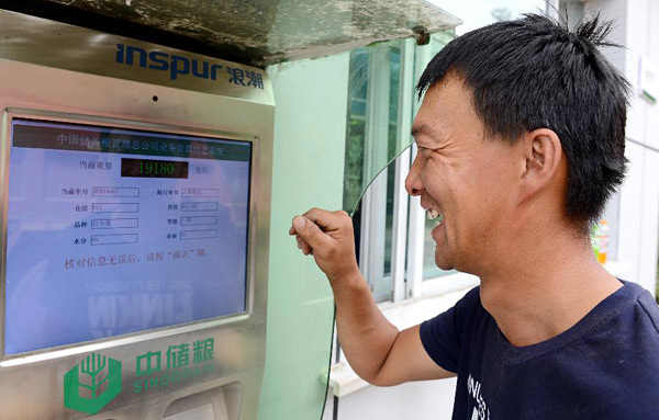 在位于新疆昌吉回族自治州奇台县的中央储备粮收购站,农户徐列荣在“一卡通”收购系统的屏幕上查看自己当日交粮的评定结果与信息(7月25日摄)。当全国进入高温“炙烤”的7月伏天,新疆天山南北迎来了夏粮成熟丰收的时节。新华社记者 马锴 摄