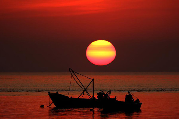 7月26日在山东蓬莱市海滨拍摄的海上日出。当日早晨,一轮红日从山东蓬莱海面上冉冉升起,将天际染红。 新华社发(于良意 摄)