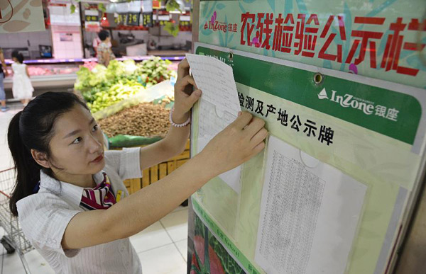 7月20日,在山东滨州滨城区一超市里,工作人员在农残检测公示栏里公示果蔬检测结果及产地。日前,山东省滨州市滨城区实施“食品快速检测室全覆盖工程”,在大型农贸市场、超市建起食品快速检测室,并配备相应快检设备和检测人员,每天对水果蔬菜、生熟食及水产等开展农药残留、甲醛、亚硝酸盐、瘦肉精等常规项检测,并将检测结果及时公示,以保障市场供应食品安全。新华社发(李荣新 摄)