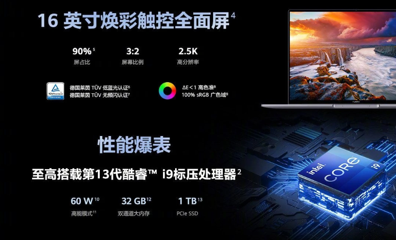 相信对于从事专业创作,以及重度职场办公人士来说,一款是否强大的生产力设备往往就决定了定稿作品的好坏,或者个人业绩和团队项目的进度情况。而华为MateBook 16s作为华为专业性能单品,在性能方面,搭载了第13代英特尔®酷睿标压处理器、最高搭载i9-13900H,高性能模式支持60W TDP满血释放。让图形处理、视频剪辑和编程开放等工作更加游刃有余。而且全系EVO认证、32G运存+1T存储,以及全面升级的Super Turbo,不仅后台多任务处理丝滑流畅,开机速度更加迅捷,大大提升工作效率。