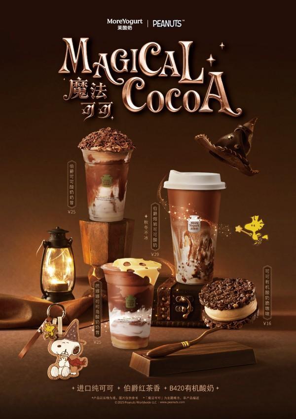 本次携手花生漫画,茉酸奶上新了芭娜娜可可岛酸奶奶昔、伯爵可可酸奶奶昔、伯爵熔岩可可酸奶、可可有机酸奶脆墩墩等可可系列联名特色产品。可可本身具有温暖、治愈属性,与秋冬氛围高度契合,也为联名主题“Magical Cocoa”提供了多元的产品支撑。